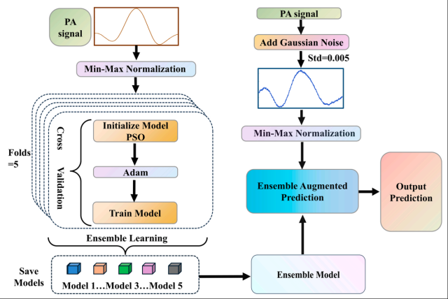团队提出了一种基于粒子群优化与集成增强预测策略的卷积神经网络模型(PSO-EAP-CNN),解决了光声光谱气体检测中噪声引起的信号相关性退化问题。该模型通过多尺度特征提取机制与粒子群算法优化网络参数,显著提升了模型收敛速度和预测稳定性;同时引入集成增强预测策略,在噪声环境下进一步增强模型的鲁棒性和泛化能力。实验表明,PSO-EAP-CNN相比传统CNN模型,预测精度提升显著:平均绝对误差降低43.76%,均方根误差降低39.25%,平均绝对百分比误差降低51.15%。本研究为复杂噪声环境下的痕量气体检测提供了新方法,推动了深度学习在光声光谱领域的应用发展。该成果发表于《Photoacoustics》(《光声学》,中科院一区TOP,影响因子7.1),2023级硕士研究生苏占上为论文第一作者,王朋朋副教授、朱存光副教授和中国海洋大学王福鹏副教授为共同通讯作者,茄子视频 为第一署名单位。