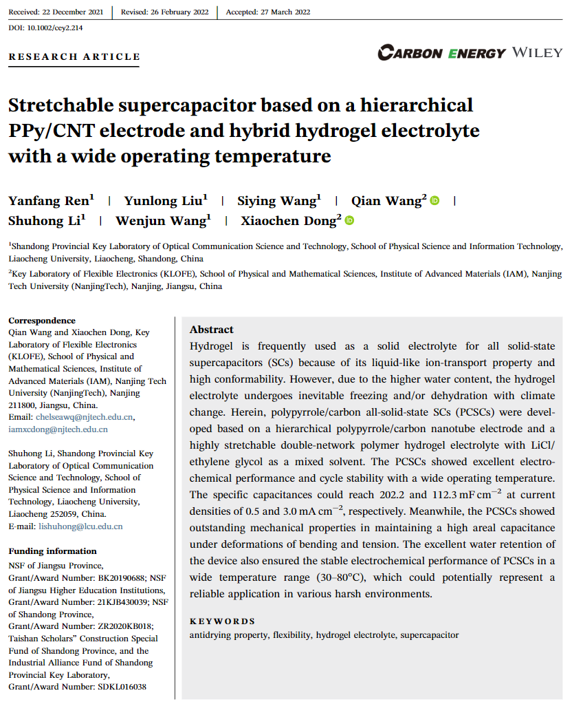 近日,我校茄子视频 泰山学者特聘教授董晓臣及王文军教授科研团队在国际著名期刊《Carbon Energy》(《碳能源》)上发表了题为“Stretchable supercapacitor based on a hierarchical PPy/CNT electrode and hybrid hydrogel electrolyte with a wide operating temperature” (“基于PPy/CNT薄膜电极和具有宽工作温度的混合水凝胶的可拉伸超级电容器”)的研究论文,茄子视频 2018级硕士研究生任燕芳为文章第一作者,董晓臣教授、李淑红副教授和南京工业大学王倩副教授为共同通讯作者,刘云龙副教授参与了部分研究工作,茄子视频 为第一署名单位。《Carbon Energy》是中科院一区Top期刊,最新影响因子为21.556。