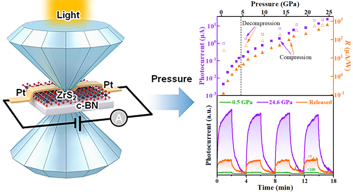 压力可以通过调控材料的晶体结构,进而实现对材料光电性能的调控。ZrS2作为一种典型的过渡金属硫族化合物(TMDs),相比于被广泛研究VIB族TMDs,理论上具有更优异的电子和光电性质,且在光电探测器、场效应晶体管和传感器等领域具有巨大应用潜力。作者们利用基于金刚石对顶砧的高压原位光电流、拉曼散射光谱、交流阻抗谱、吸收光谱的测量手段和理论计算方法相结合系统地研究了高压下层状ZrS2的光电性质。研究表明,加压过程中,随着压力的增加,层状ZrS2的光电流值持续增加,最终其光电流实现了三个数量级的增加;且拥有高光电响应的ZrS2高压相可以截获至常压。ZrS2的晶体结构、电输运性质和禁带宽度也均受压力调控。此项研究为科研工作者通过高压合成性能优异的TMDs光电功能材料提供了新的思路,对未来光电器件性能的提升具有重要意义。我院2021级硕士生王娜和张国召博士为共同第一作者,冯振豹副教授、张海娃博士和刘才龙教授为共同通讯作者,茄子视频 为第一署名单位。