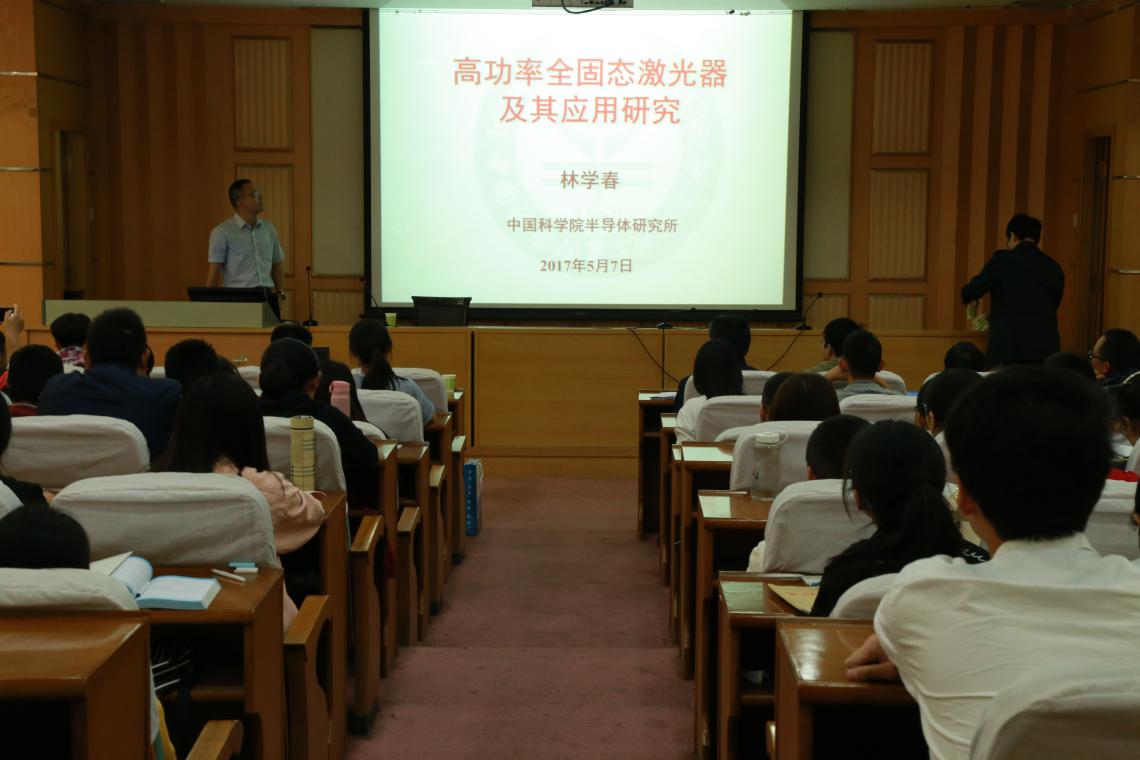 会议期间,胡章贵研究员、林学春研究员及课题参与单位负责人及技术骨干参观了我院的实验室并与部分教师进行了学术交流。胡章贵研究员、林学春研究员还为我院的师生做了题目分别为“晶体材料及其应用研究”和“大功率全固态激光器及应用” 的精彩的学术报告。两个报告开阔了在座师生的视野,为我院光学薄膜材料及激光技术的研究提供了很好的指导。