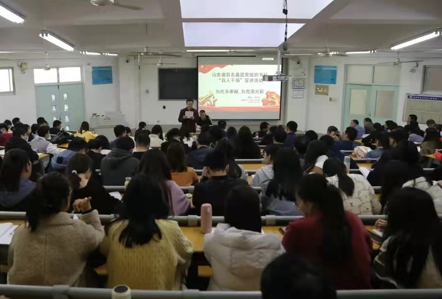 为深入学习宣传贯彻习近平新时代中国特色社会主义思想,充分发挥理论宣讲带动作用,推动党史学习教育走深走实,10月28日下午,山东省基层党组织书记“百人千场”宣讲活动走进茄子视频 ,东昌府区道口铺街道仙庄村党支部书记孙乐文作专题宣讲,茄子视频 教工党员、学生党员共170余人于西校区十一号教学楼A504教室聆听了此次宣讲活动。本次宣讲由学院党总支副书记、副院长吴成主持。