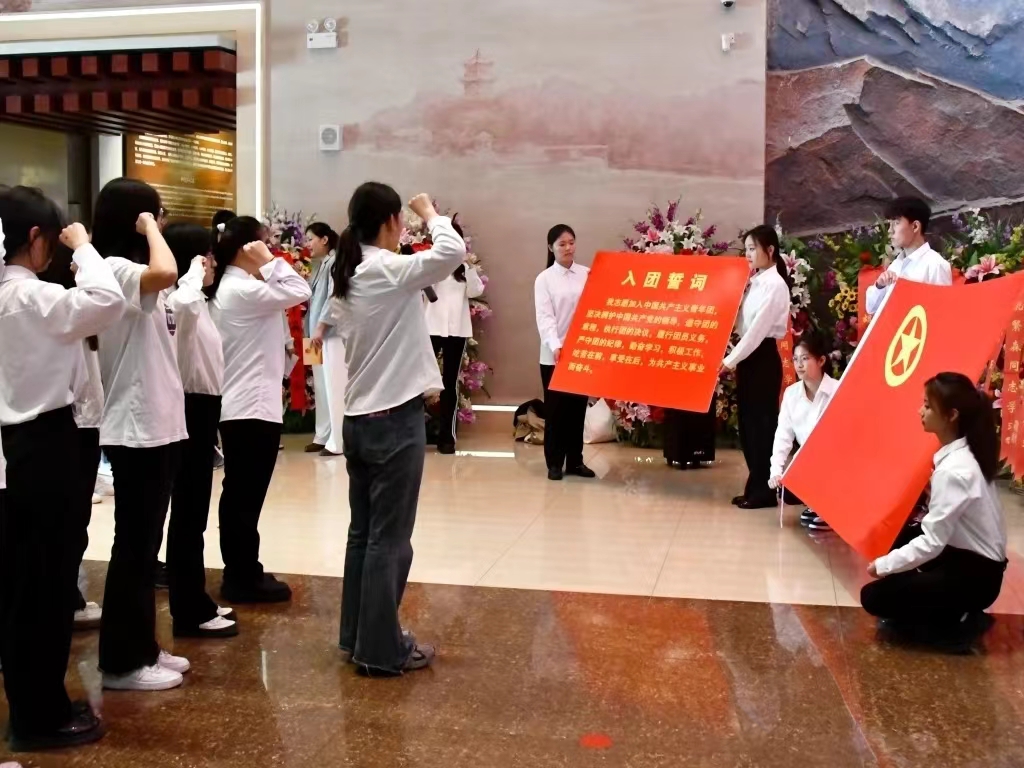 仪式在庄严肃穆的国歌声中拉开帷幕。仪式宣读了新发展团员名单,各学院团委书记为新发展团员佩戴团徽并颁发团员证。新发展团员面向团旗、右手握拳过肩,在鲜艳的团旗下庄严宣誓。新发展团员代表孙文晓作了表态发言,表示将在团组织的指导下,发愤图强,努力成长为堪当民族复兴重任的时代新人。优秀团员代表张钰琪从自身经历出发,鼓励新发展团员们要努力成为信念坚定、求真尚学、实干有为的奋斗者。