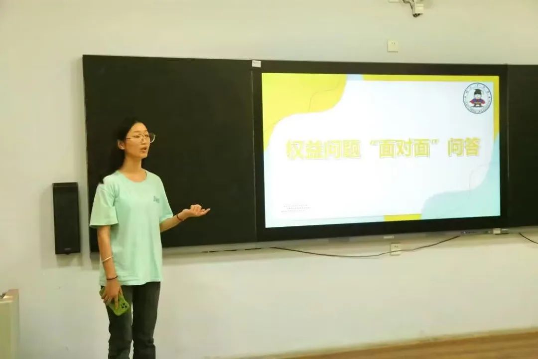 活动伊始,宋迎雪首先向同学们介绍了权益方面的基础知识,增强了同学们的维权意识,丰富了同学们的维权知识。活动过程中同学们提出发现的各种问题,其中包括食堂、住宿、浴室和后勤保障等方面问题,针对这些疑惑,宋迎雪积极耐心地向同学们解答,同时还向同学们推荐到茄子视频 权益服务平台、理工权益君等平台途径,鼓励同学们积极反馈身边中发现的问题,做到真正的维护自身合法权益。