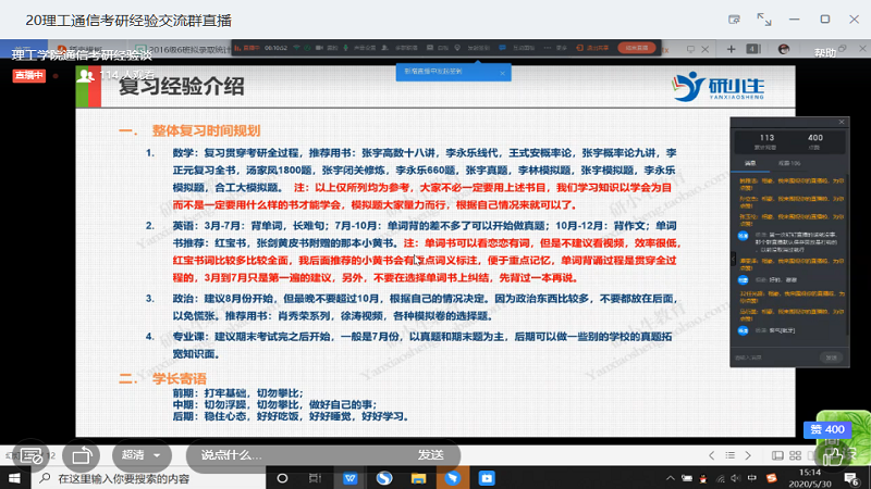 本次会议通过钉钉进行线上交流,四位主讲人讲述了自己的备考过程,以及学习资料的选择与应用,给备考学生提供了一个可供参考的学习过程。在简单介绍20届本次考研上岸的情况后,考取西南交通大学的王泽文开始讲述自己的学习经验,并推荐了备考资料以及在不同时间段的使用方法。他强调,备考过程中的时间分配及其重要,每一科都必须分为巩固基础,强化和复习三个阶段,让与会同学们深入了解了备考过程。紧接着,考取南京邮电大学的李旭冉针对如何复习数学和英语的问题向同学们热情洋溢地分享起自己的复习过程,多做真题,回归课本,合理安排时间,每一个要点都让与会学生受益匪浅。