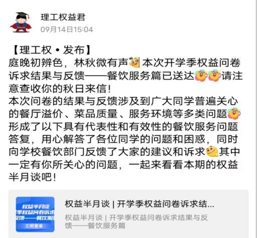 通过权益委员、理工权益君、理工权益工作交流群,多渠道、多方面了解同学们的各类权益问题以及日常需求,并与学校物业、餐厅、浴室等工作人员反映,及时解决同学们的问题。