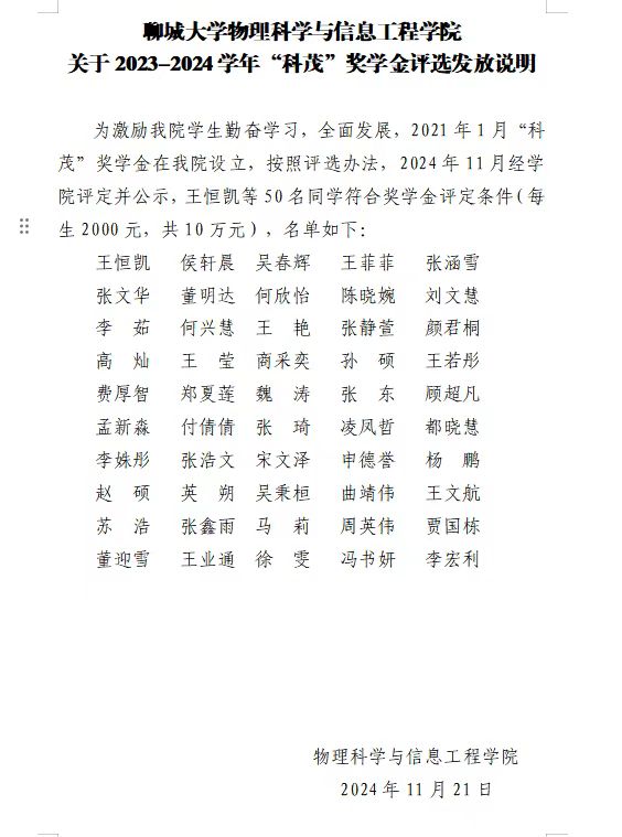 12月4日,我院2024年度科茂奖学金已全部发放完成。“科茂”奖学金由我院85级优秀校友、现任浙江科茂环境科技有限公司董事长辛本恩设立。自2021年在我院设立科茂奖学金,每年出资10万元用于奖励我院在学习、科研、创新和创业等方面品学兼优的在校生,共计50人。