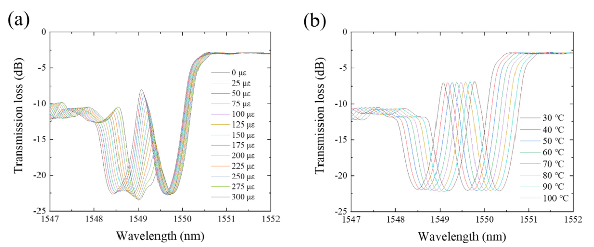 图1 (a)不同应变对应的透射光谱变化;(b)温度变化导致的透射谱变化