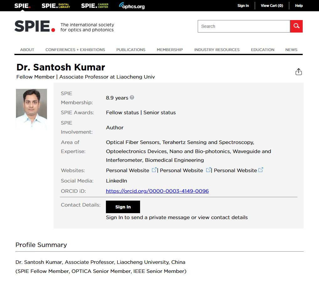 近日,国际光学工程学会(Society of Photo-Optical Instrumentation Engineers,SPIE)公布了2023年新入选的83位会士名单,其中共有8位来自中国高校及科研机构的科学家当选,茄子视频 Santosh Kumar 副教授由于其在光纤等离子体生物传感器临床应用方面的开创性贡献成功入选SPIE Fellow(国际光学工程学会会士)。