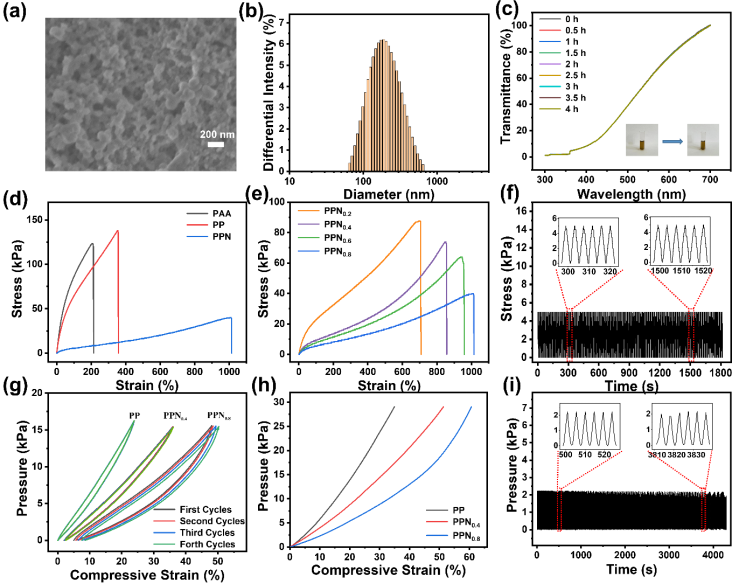 图2. ( a , b)PPy-PDA NPs在水中的SEM照片及粒径分布。( c )离子凝胶前驱体溶液的透过率-时间曲线(插图:前驱体溶液拍摄4小时的照片)。( d , e) PAA、PAA / PDDA (PP)、PAA / PDDA / PPy-PDA NPs (PPN)和不同PPy - PDA NPs含量的离子凝胶的机械性能。( f ) PPN离子凝胶在40%应变下的循环应力-应变曲线。( g ) 3种离子凝胶在15 kPa压力下的机械弛豫。( h )不同PPy-PDA NPs含量的离子凝胶的压力-压缩曲线。( i ) PPN离子凝胶在2.26 kPa压力下的压缩循环稳定性。