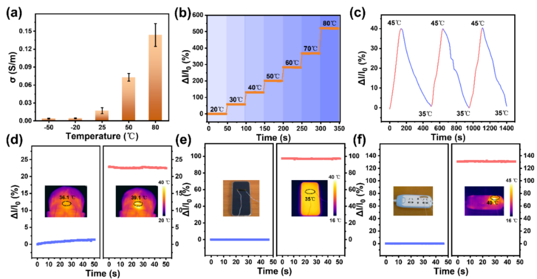 图5. 离子凝胶传感器的温敏性能。( a )不同温度下离子凝胶的电导率。( b )不同温度下离子凝胶的相对电流变化。( c ) 35 °C和45 °C温度偏差循环中的相对电流变化。相对电流变化为( d-f )人体发热、手机和插线板使用时变热。