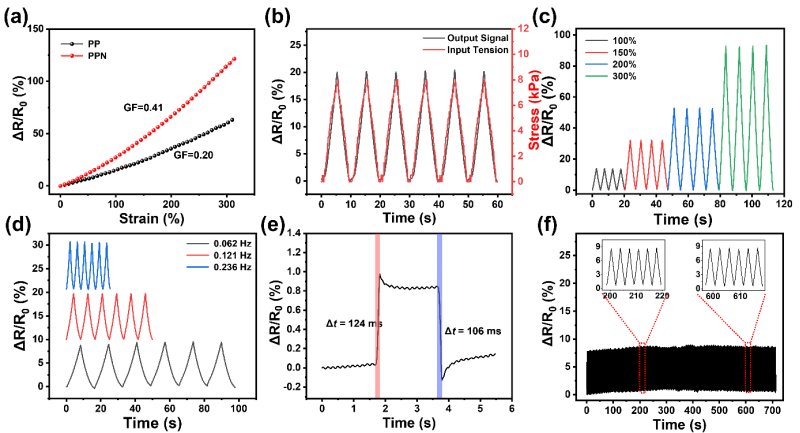 图6. PPN离子凝胶应变传感器的电学性能。( a ) PP和PPN离子凝胶应变传感器的相对电阻变化。( b )机电滞后。( c )传感器在不同拉伸应变下的电学响应。( d )不同拉伸频率下传感器的频率依赖行为。( e )传感器在微小拉伸(拉伸速度: 330 mm·min-1)时的响应时间。( f )传感器在40%拉伸应变( 查图:放大稳定性能)下的电循环稳定性。