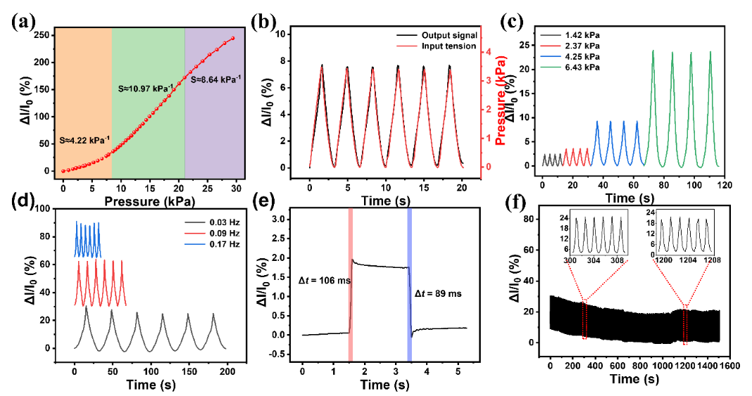 图7. PPN离子凝胶压力传感器的电学响应。( a ) 0 ~ 29.4 kPa压力范围内的相对电流变化。( b )机电滞后。( c )传感器在不同压力下循环四次的电学响应。( d )不同频率下传感器的相对电流变化。( e )传感器在微小压力下的响应时间。( f )传感器在2.26 kPa压力(插图:放大稳定性能)下的电循环稳定性。