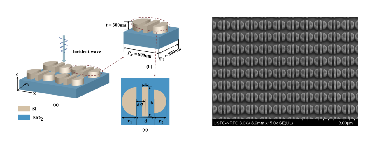 图1(a)所设计的超表面示意图 (b)实验样品SEM图