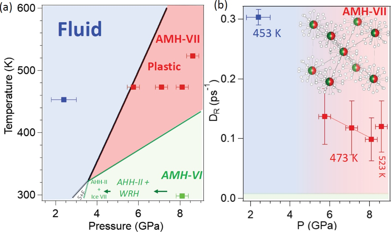张海娃博士所在泰山学者刘才龙教授课题组一直致力于极端条件下氨水体系的物态和物性研究。通过拉曼散射,X射线衍射和准弹性中子散射光谱测量实验,详细研究了AMH在高温高压条件下出现的新固体相AMH-VII(如图1所示)。拉曼散射和X射线衍射光谱测量实验结果表明,AMH-VII与常温下发现的无序离子-分子合金相(DIMA)具有一些相同的结构特征,即它们都具有体心立方结构,每个晶格位置处O和N是可以相互无序代替,并且都是由分子和离子共同组成,其中分子占主导。然而,AMH-VII与DIMA在分子动力学方面有显著的不同,准弹性中子散射实验表明AMH-VII分子会绕着分子质量中心自由旋转,是一种塑性固体。由此可知,AMH-VII是DIMA的塑性相形式,同时具备了三种无序特征:O/N替代无序性,分子/离子组成无序性,自由旋转无序性。AMH塑性相的出现和稳定存在的温度压力范围,对部分木星卫星,如泰坦(Titan)、阿里尔(Ariel)和恩刻拉多斯(Enceladus)以及亚海王星大小的系外行星内部模型的建立,具有重要的指导意义。
