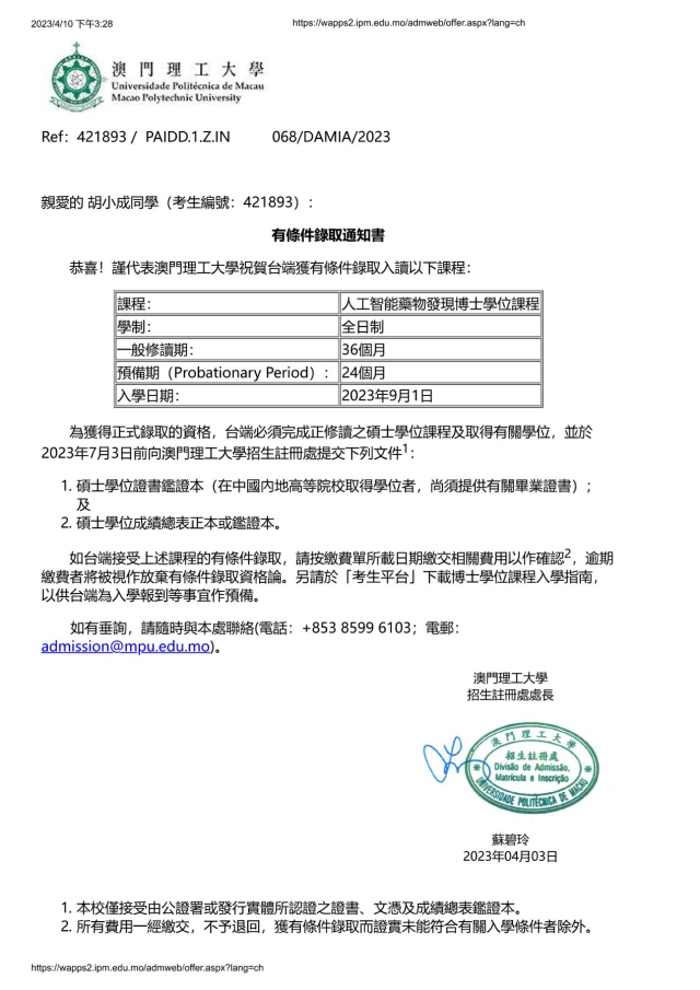2022年12月份,胡小成在导师的鼓励下开始申请澳门理工大学的博士研究生,经过材料审查、第一轮面试、理论公式推导考核、第二轮面试和第三轮面试(全英文面试)等5轮考核,在激烈的竞争中脱颖而出,并获得了人工智能药物发现专业唯一的最高额奖学金,为学校争得了荣誉,也充分显示了我院的研究生培养正向高水平发展。