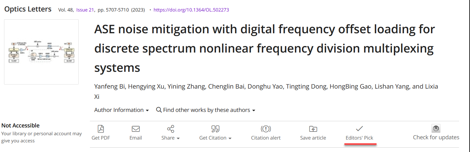 本项工作被Optics Letters期刊评选为当期的Editor's Pick(编辑精选)文章,意味着该工作得到了编辑部的高度认可,认为该工作具有较高的科研价值并在DS-NFDM系统的研究领域非常具有代表性。
