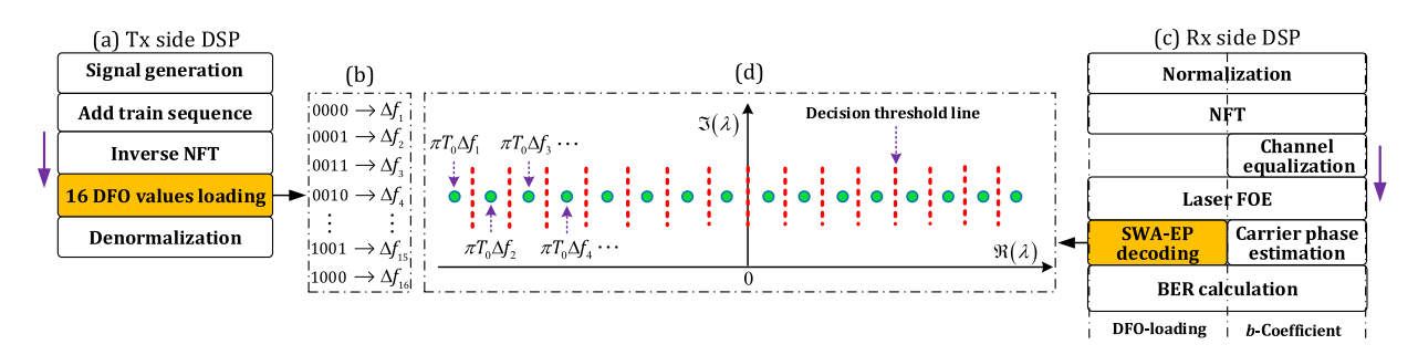 在这项工作中,针对离散频谱非线性频分复用(DS-NFDM)系统,该研究提出了一种利用数字频率偏移加载的放大自发发射(ASE)噪声缓解方案。基于频率偏移与特征值位置之间的一对一映射关系,本研究在发射机处将4位信息编码到16种不同的数字频率偏移上。在接收机处,进一步提出了一种滑动窗口辅助的特征值位置解码技术来恢复原始信息。仿真和实验结果表明,与经典方案相比,该方案在15dB光信噪比下Q因子的增益为2.1dB,在800km光纤传输后增益为Q因子1.8dB。这项研究成果为降低DS-NFDM系统的ASE噪声提供了一种有效的、低复杂度的方法。
