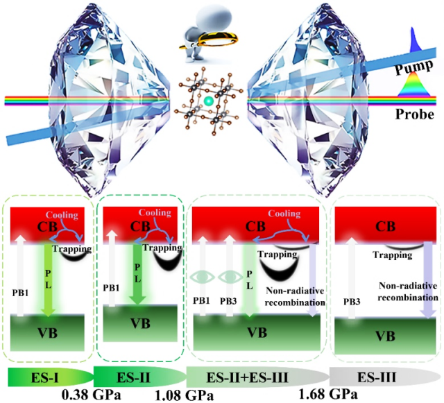 进展一:钙钛矿材料中的载流子超快动力学行为一直以来备受关注。刘才龙教授团队利用高压原位稳态光致发光、稳态吸收和飞秒瞬态吸收光谱探测技术,对CsPbBr3量子点压致电子态转变、荧光猝灭和带隙演化中的超快动力学行为进行了实验探究。研究发现,高压原位飞秒瞬态吸收光谱可以有效区分混合电子态,并获得压力依赖的载流子超快动力学寿命,揭示了CsPbBr3量子点压致荧光猝灭和消失的微观物理机制。这项工作对于改善钙钛矿材料的光物理性能至关重要,为拓宽其在光电探测器、发光二极管和太阳能电池等领域的应用提供了重要的指导。相关研究成果以“Ultrafast Dynamics across Pressure-Induced Electronic State Transitions, Fluorescence Quenching, and Bandgap Evolution in CsPbBr3 Quantum Dots”(CsPbBr3量子点在压力诱导的电子态转变,荧光猝灭和带隙演化过程中的超快动力学)为题发表在《Advanced Science》(《先进科学》)上。2021级硕士生陈林和楚亚博士为共同第一作者,张海娃博士、郑州大学郭海中教授和刘才龙教授为共同通讯作者,茄子视频 为第一署名单位。