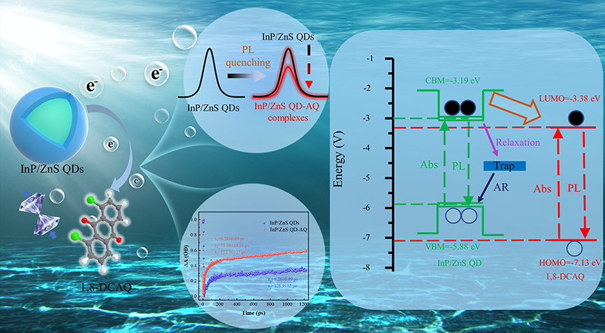 电子转移速率的调控对提高电子转移系统的光电转换效率至关重要,近年来逐渐成为研究热点。刘才龙教授团队利用高压原位瞬态吸收光谱探测技术,提出了压力调控甲苯中InP/ZnS量子点-蒽醌(InP/ZnS QD-AQ)复合体系电子转移的影响机制。研究表明,从常压至0.9GPa,压致供-受体间距的减小可以有效促进InP/ZnS QD-AQ复合体系的电子转移过程;从0.9GPa至2.1GPa,InP/ZnS QD-AQ复合体系的电子转移过程被抑制是压致InP/ZnS量子点的量子限域效应和蒽醌分子的压致AIE效应共同作用的结果。此项工作为基于供-受体复合体系光电器件的发展提供理论依据,并将促进其在光电转换领域中的应用。相关成果以“Electron transfer tuned by pressure-dependent aggregation-induced emission in InP/ZnS quantum dot-anthraquinone complexes(通过压力依赖的聚集诱导发光调控InP/ZnS量子点-蒽醌复合体中的电子转移)”为题发表在《Applied Physics Letters》(《应用物理快报》)国际期刊上。2021级硕士生秦霞霞和张海娃博士为论文共同第一作者,楚亚博士、王庆林教授、郑州大学郭海忠教授和刘才龙教授为共同通讯作者,茄子视频 为第一署名单位。