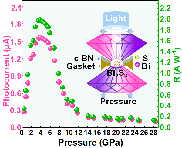 Bi2S3具有低毒性、低合成成本、吸收系数及载流子迁移率高等优点,成为光电探测器的潜在候选者。然而,由于其电子-空穴复合速度快和光腐蚀等影响降低了其光敏行为。为克服这一挑战,刘才龙教授团队提出压力调控Bi2S3光电响应的方案。通过将高压原位光电流、变温电阻率、拉曼散射光谱、可见吸收光谱测量和理论计算方法相结合,系统研究了压力作用下Bi2S3的光电、电输运、振动模式和能带结构。研究发现,压力作用下Bi2S3显示出两种不同的光响应信号(正/负光电流),0.5~4.0GPa范围内光电流随压力的增加出现显著增强(最大值约为初始值的5.6倍)。在30.3GPa以上,Bi2S3呈现负光电流响应,可归因于压致金属化相变引起的光热效应。研究结果为调控Bi2S3的光电性能提供了新思路,为优化基于Bi2S3光电子器件提供了更多的可能性。相关成果以“Pressure-induced photo responsiveness enhancement and positive–negative switch in Bi2S3(Bi2S3中的压力诱导光响应增强和正负光电流转换)”为题发表在《Applied Physics Letters》(《应用物理快报》)上。2021级硕士研究生冯浩铖和张国召博士为论文共同第一作者,王光宇博士、房媛媛副教授和冯振豹副教授为共同通讯作者,茄子视频 为第一署名单位。