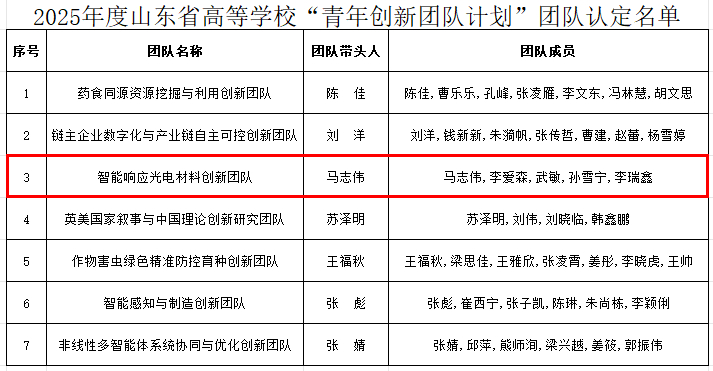 近日,山东省教育厅发布《关于公布2025年度山东省高等学校“青年创新团队发展计划”认定名单的通知》,我院推荐的“智能响应光电材料创新团队”通过认定。