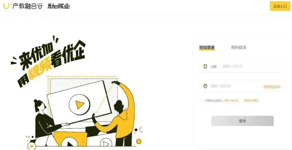 登录优加就业 — 选择短信登录或账号密码登录 — 填写个人信息 — 上传简历。