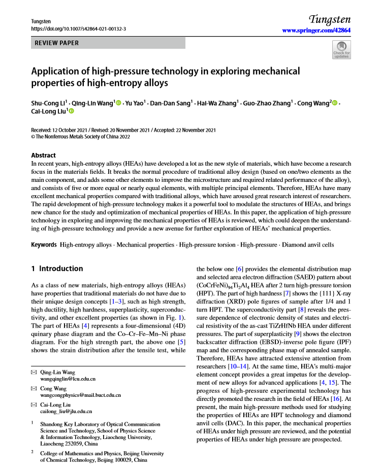 第一、虎年新春第一天,茄子视频 2019级光电信息科学与工程专业本科生李树聪同学以第一作者身份在有色金属领域高质量科技期刊《Tungsten》(《钨》)发表了题为”Application of high-pressure technology in exploring mechanical properties of high-entropy alloys”(“高压技术在高熵合金力学性能研究中的应用”)的综述文章,我校王庆林副教授、刘才龙教授为论文的通讯作者,茄子视频 为第一通讯单位。