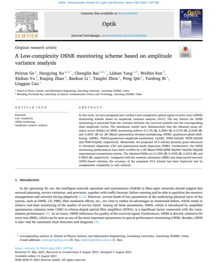 第二、2021年8月份,我院2018级通信工程专业本科生葛佩云同学以第一作者身份在光学领域高质量科技期刊《Optik》(《光学》)发表题为”A Low-complexity OSNR monitoring scheme based on amplitude variance analysis”(“一种基于幅度方差分析的低复杂度光信噪比监测方案”)的研究论文,我校许恒迎教授、白成林教授为通讯作者,茄子视频 为第一通讯单位。